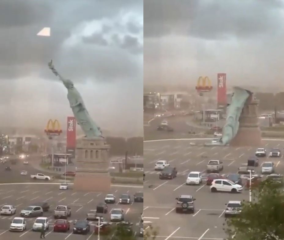 브라질 남부 지역에서 시속 90km 안팎의 강풍이 불면서 한 백화점에 있던 ‘자유의 여신상’ 복제 조형물이 쓰러졌다.