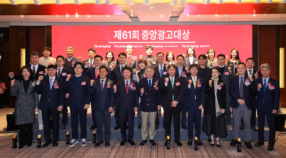 16일 서울 중구 조선호텔에서 열린 ‘제61회 중앙광고대상 시상식’에서 참석자들이 기념촬영을 하고 있다. 앞줄 왼쪽부터 양성회 하나투어 본부장, 정철경 우리은행 부장, 이건민 르무통 팀장, 고건웅 한국도로공사 부장, 김종윤 중앙일보 부사장, 이명천 심사위원장, 김기홍 하나금융 상무, 박진영 KB금융 상무, 김우경 SK이노베이션 부사장, 황성연 GS칼텍스 홍보부문장, 신용호 중앙일보S 대표이사. 둘째줄 왼쪽부터 박천우 중앙일보 비즈솔루션본부장, 김태권 하나증권 실장, 권기경 롯데관광개발 상무, 김종혁 신한카드 본부장, 김수영 신한투자증권 본부장, 최상인 동서식품 상무, 나범수 KT 상무, 김봉규 인천도시공사 부장, 박상곤 인천경제자유구역청 보도팀장, 정제원 중앙일보 광고사업본부장. 뒷줄 왼쪽부터 김창훈 워너브러더스 차장, 유장수 친환경농산물자조금관리위원회 위원장, 조재성 육우자조금 관리위원회 위원장, 이자연 한양대 미디어전략실장, 허용무 정화예술대 총괄부총장, 김상연 광운대 대외국제처장, 이영주 서울과학기술대 홍보실장, 이정미 불가리 이사, 신은정 한국생명존중희망재단 본부장, 박연선 KT&G 부장.