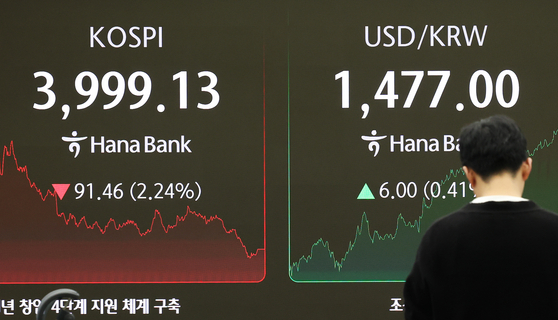 인공지능(AI) 산업 거품 우려와 미국 경제지표에 대한 경계 심리가 겹치며 코스피가 장중 4000선 아래로 내려간 16일 서울 중구 하나은행 딜링룸 전광판에 이날 종가가 표시되고 있다. [뉴스1] |