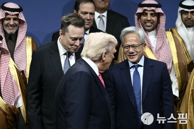 미-사우디 투자 포럼에서 도널드 트럼프 미국 대통령과 인사 나누는 젠슨 황 [사진=블룸버그] |
