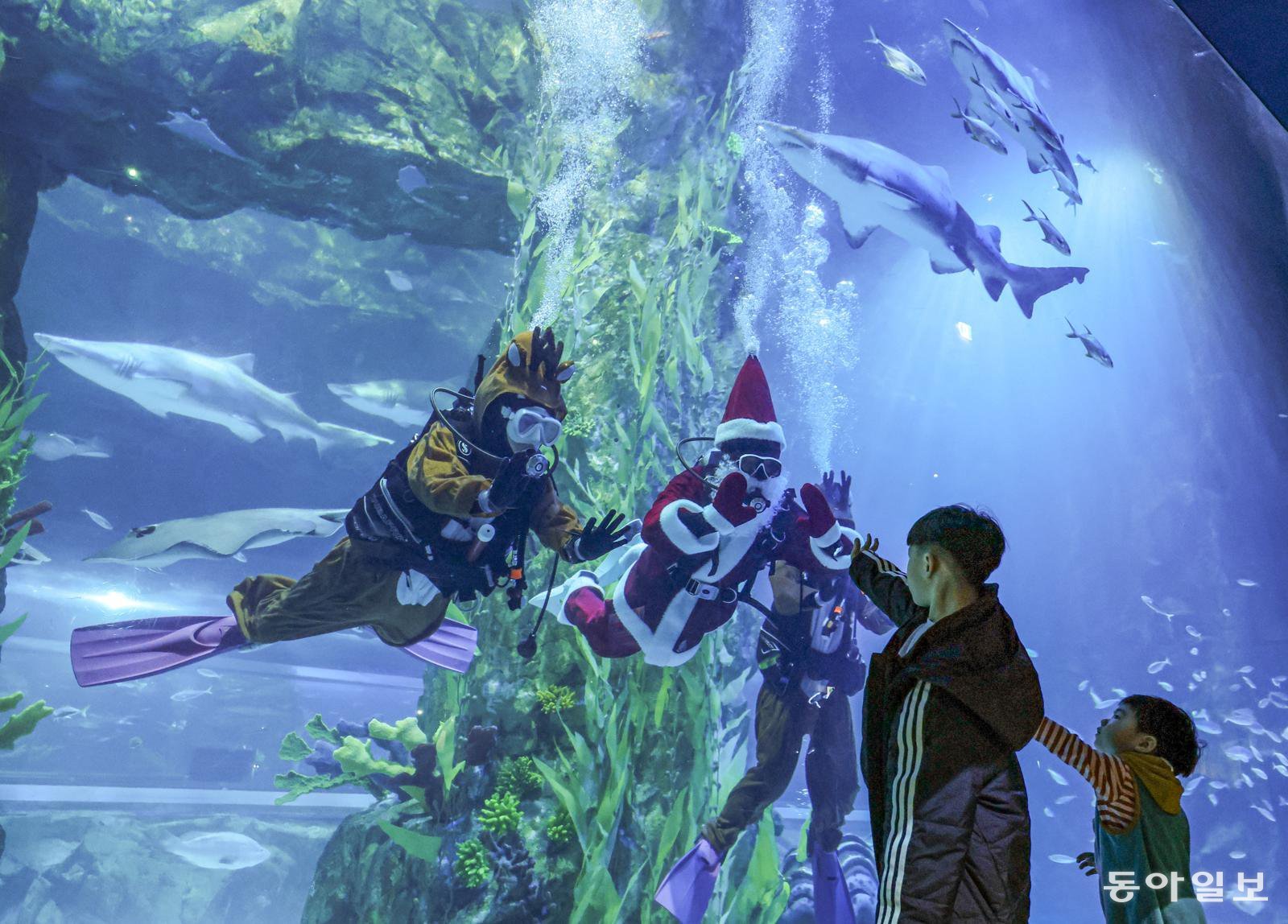 16일 서울 송파구 롯데월드 아쿠아리움 메인 수조에서 산타와 루돌프 복장을 한 아쿠아리스트들이 방문객들을 향해 손을 흔들며 인사하고 있다. 롯데월드 아쿠아리움은 크리스마스를 맞아 19일부터 28일까지 산타와 루돌프로 변신한 아쿠아리스트가 1일 2회(오후 2시, 4시 30분) 수중 퍼포먼스를 선보이는 이벤트를 진행한다.