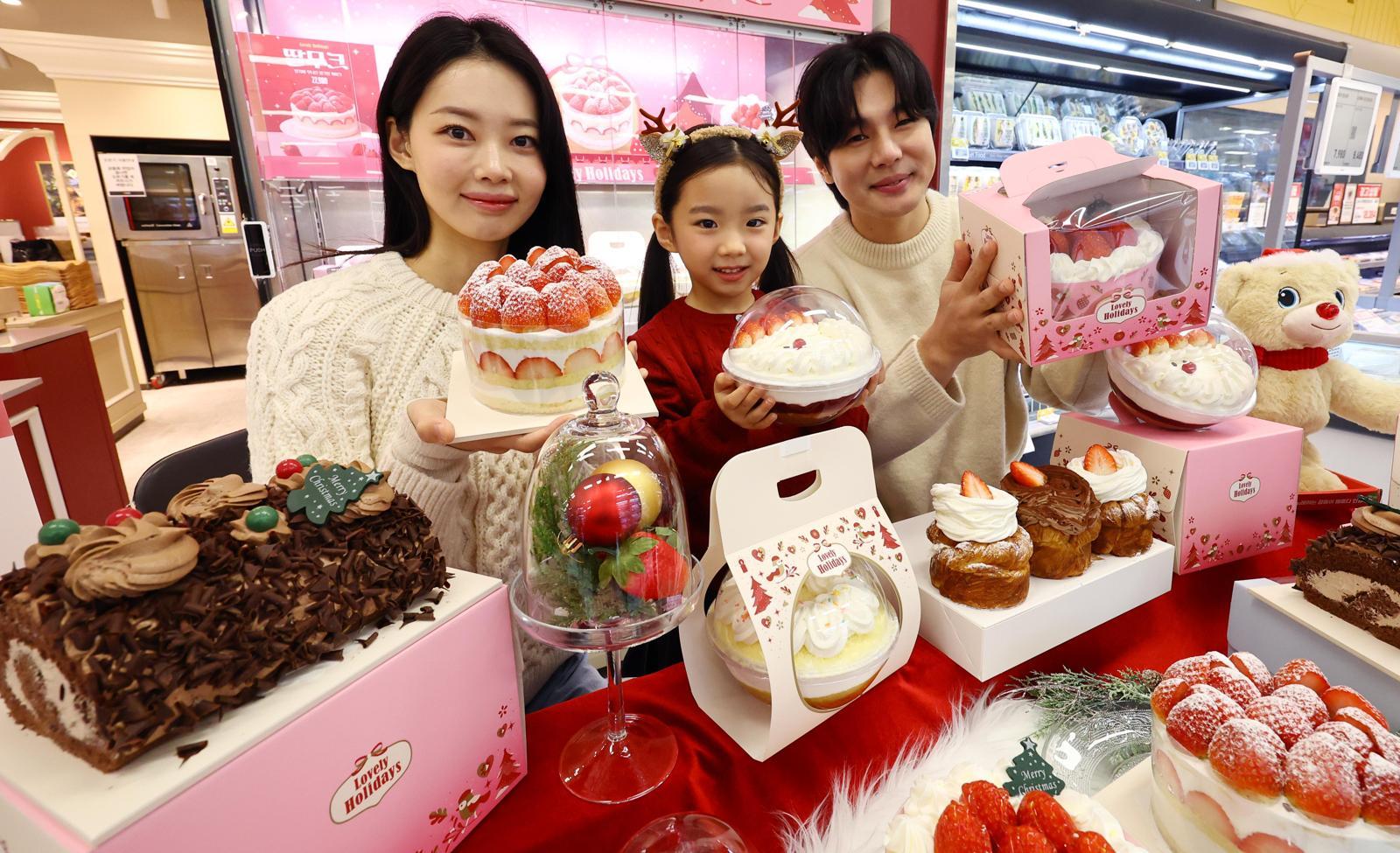 16일 서울 이마트 용산점 베이커리 매장에서 모델들이 이마트에서 출시한 신상 케이크 제품을 소개하고 있다. 이마트는 연말을 맞아 신세계푸드의 겨울 딸기 홀케이크를 출시했다고 밝혔다.
