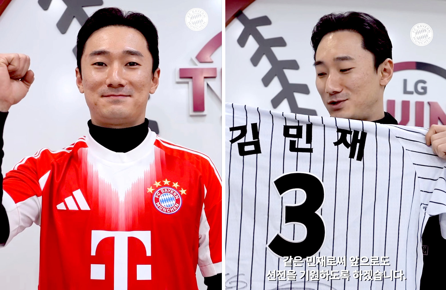 독일 프로축구 팀 뮌헨은 15일 한국프로야구 LG 소속 신민재가 뮌헨 김민재의 유니폼을 입은 동영상을 올렸다. 오른쪽 사진은 신민재가 김민재의 등번호 3이 마킹된 LG 유니폼을 들어 보이는 모습. 바이에른 뮌헨 소셜미디어 캡처 |