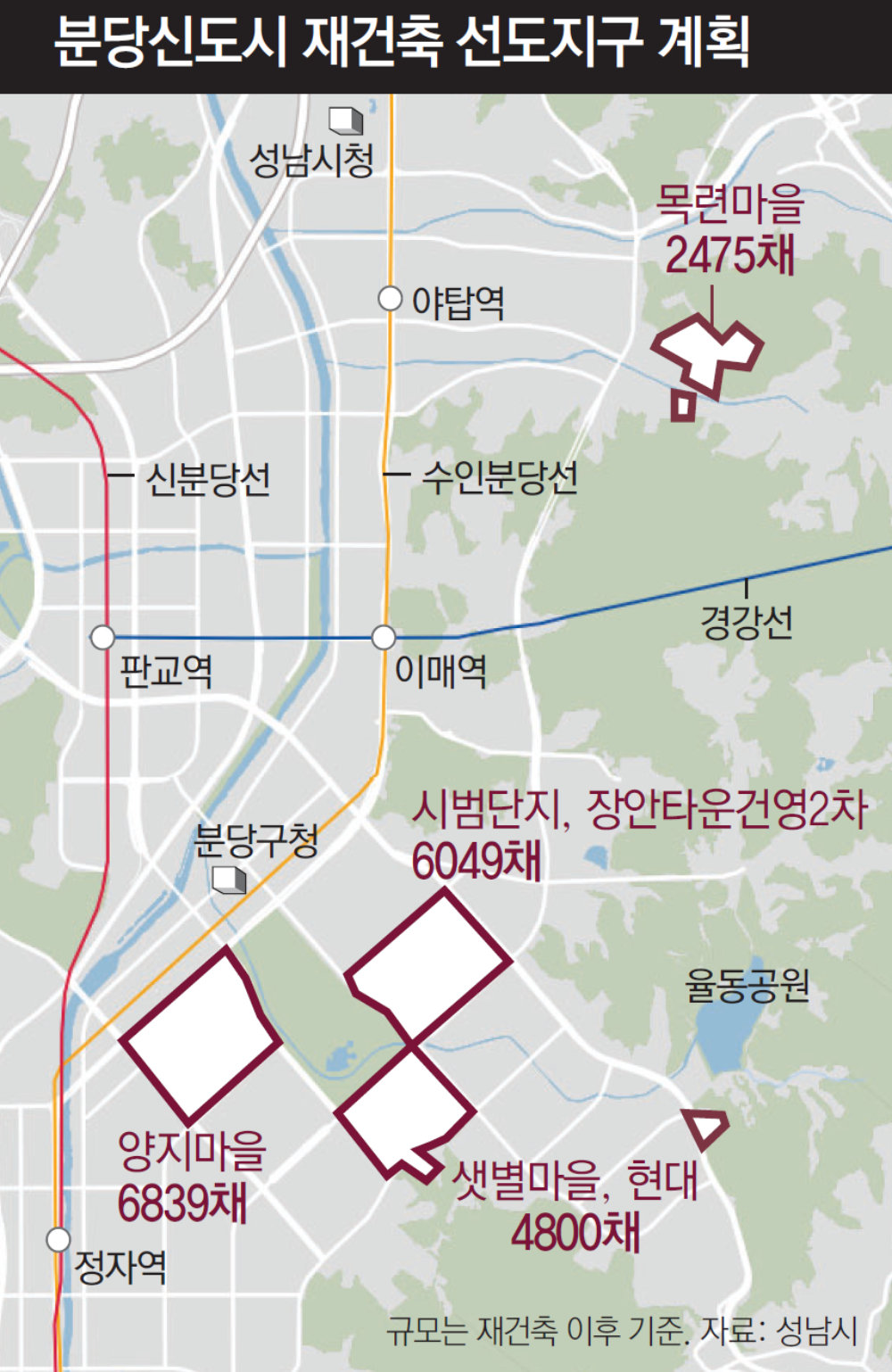 성남시는 15일 오후 도시계획위원회를 열고 분당 재건축 선도지구 4곳이 제출한 특별정비구역 지정안 등을 심의해 조건부로 의결했다고 16일 밝혔다. 이번에 통과한 4곳은 샛별마을(2843채), 양지마을(4392채), 시범단지(3713채), 목련마을(1107채) 등이다. 성남시는 올해 안에 특별정비구역 지정·고시까지 완료할 계획이다.