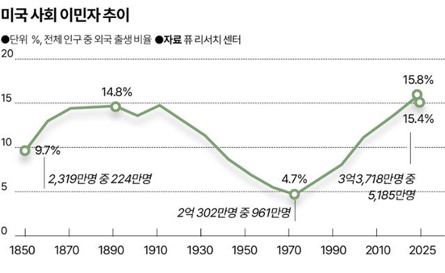 2025년 미국 내부 정세와 글로벌 종교 지형에서 구조적 변화가 나타난 것으로 분석됐다. 50년 넘게 증가하던 미국 사회에서의 이민자 비중이 감소세로 돌아섰고, ‘소프트 파워’에서 미국이 중국에 역전을 허용할 가능성이 커졌다는 내용이다. 이 같은 내용은 미국 퓨리서치센터가 16일 내놓은 ‘2025년의 주목할 만한 발견’ 자료에 포함됐다. 다음은 해당 자료의 주요 내용.