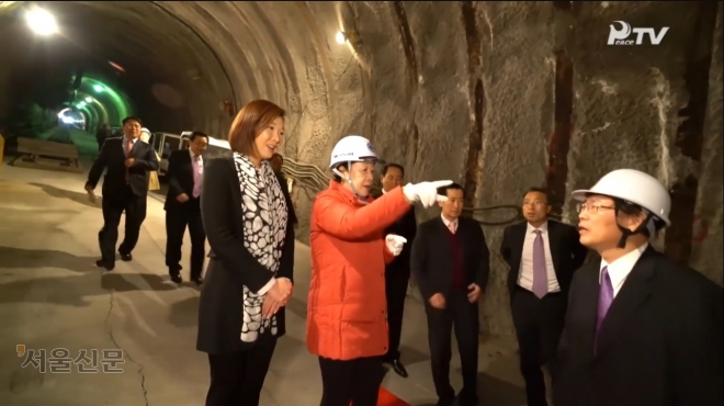일본쪽 해저터널 둘러보는 한학자 - 2016년 11월 일본 사가현 가라쓰시에서 열린 ‘동북아 평화를 위한 한일해저터널 기공 30주년 기념행사’에서 한학자(가운데) 세계평화통일가정연합 총재가 한일해저터널을 둘러보고 있다. 유튜브 캡쳐 |