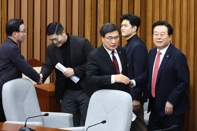 국민의힘 초선 모임 대표를 지낸 김대식 의원이 16일 신임 대표로 선출된 박상웅 의원과 인사하고 있다. 왼쪽부터 서천호·김재섭·김대식·김용태·박상웅 의원.