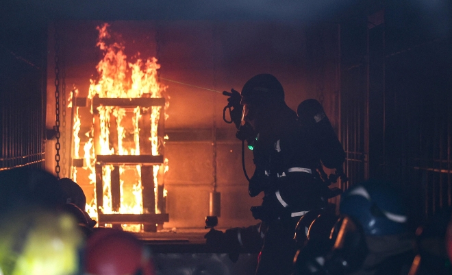 16일 대구 동구 대구소방교육훈련센터 실화재훈련장에서 열린 ‘실화재 종합훈련 역량 강화 특별 교육’에서 한 소방관이 화재 진압 훈련을 하고 있다. 대구소방안전본부는 이달 초 실화재훈련장 설치를 완료하고 시범 운영을 시작했다.