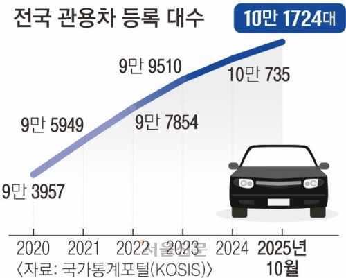 16일 국가통계포털(KOSIS)에 따르면 지난 10월 기준 전국 관용차는 10만 1724대가 등록돼 있다. 2020년 말 9만 3957대였으나 해마다 2000여대씩 늘며 2024년 10만대를 돌파했다.