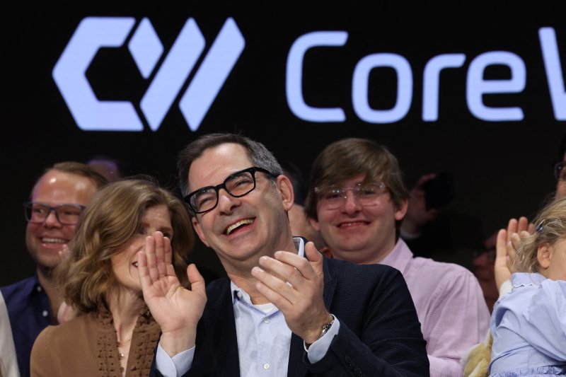 인공지능(AI) 클라우드 업체 코어위브 창업자 겸 최고경영자(CEO)인 마이클 인트레이터가 3월 28일(현지시간) 미국 뉴욕 나스닥 거래소에서 진행된 코어위브 상장식에 참석해 기쁨을 감추지 못하고 있다. 로이터 연합 |