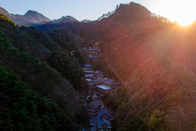 구인사 전경사진을 촬영하려면 드론이 안성맞춤이다. 사진 명소로 유명해진 이후 잦아진 드론 비행에 번잡해지면서 절 곳곳에는 ‘경내 드론 비행 금지’ 안내문이 부착돼 있다. 하지만 협곡 사이로 사찰 건물이 줄지은 최고의 구도를 잡으려면 오히려 구인사 바깥에서 촬영해야 한다. 스님의 수행을 방해하면서 경내에서 드론을 날릴 이유가 전혀 없다.