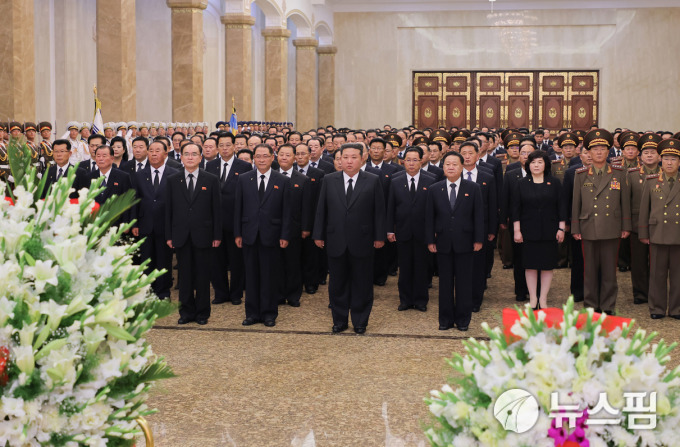 [서울=뉴스핌] 이영종 통일전문기자 = 김정은 북한 국무위원장이 김일성 사망 31주기를 맞은 8일 시신이 미이라 형태로 보관된 금수산태양궁전을 찾았다고 관영 조선주앙통신이 전했다. 앞줄 왼쪽부터 조용원 노동당 비서, 박태성 총리, 김정은, 최룡해 최고인민회의 상임위원장. [사진=노동신문] 2025.07.08 yjlee@newspim.com |