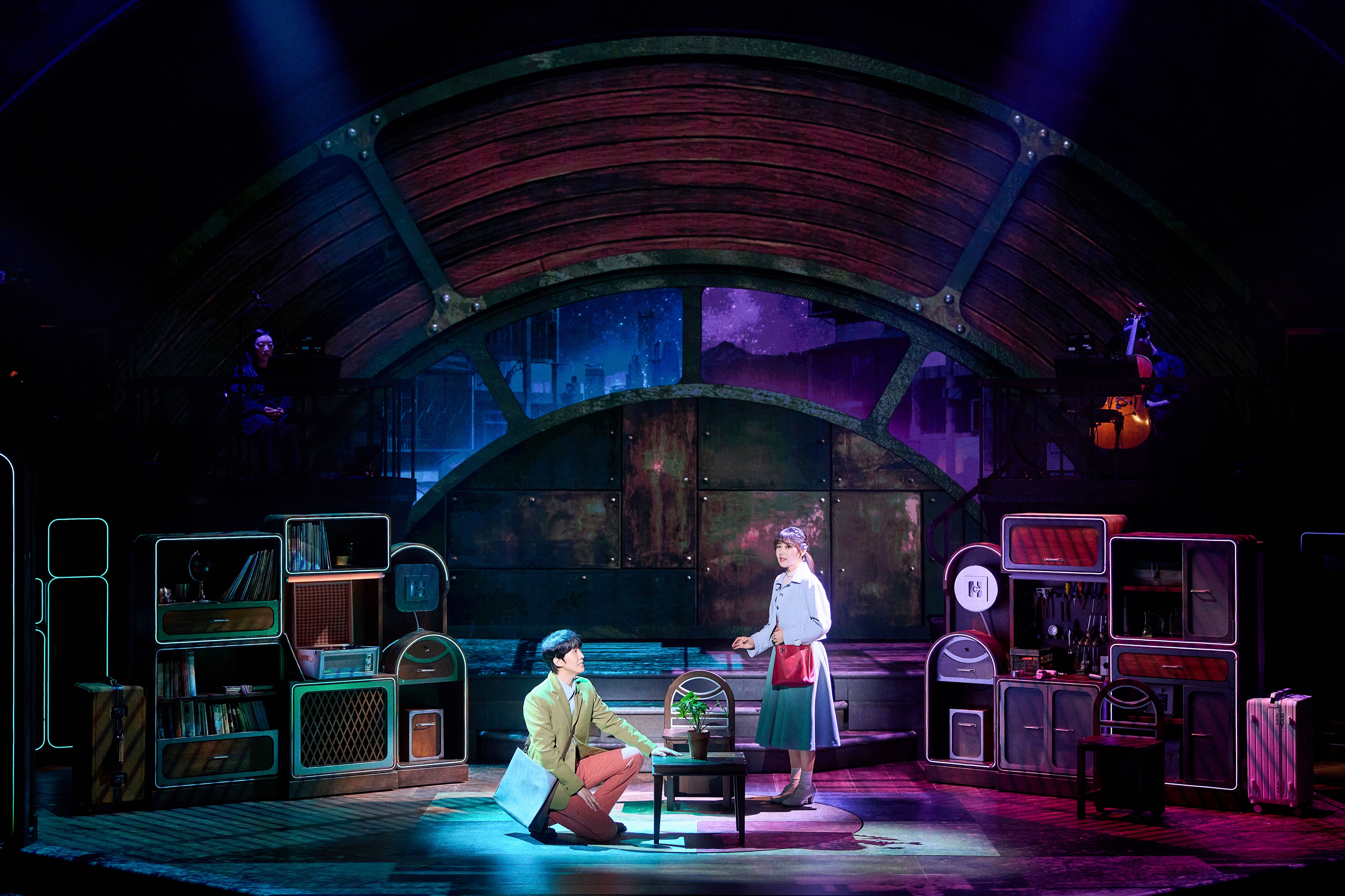 이번 <어쩌면 해피엔딩>은 350석에서 550석으로 극장의 규모를 키우면서 올리버와 클레어의 공간을 더 구체적으로 구현하였다. '낡은 레코드판'이라는 테마를 중심으로 미래적인 정서와 오래된 정서가 공존하는 작품의 특징을 구현하였으며, 이전보다 더 넓어진 영상 스크린과 감정선을 더욱 섬세하게 담아낸 조명의 변화는 관객들로 하여금 작품에 더 깊게 몰입할 수 있는 경험을 선사하였다. 규모의 확장으로 이루어진 연출적 변화에도 <어쩌면 해피엔딩>이 전하고자 하는 본질적인 메시지를 놓치지 않으며 지난 10년의 여정을 기념하는 공연다운 행보를 이어가고 있다.