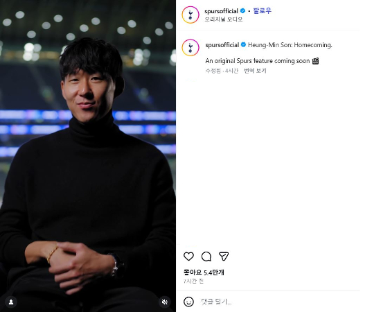 한국 팬들에게만 공개된 게시물에는 "벌써 일주일이 흘렀네요…손흥민의 마지막 순간들을 담은 스퍼스 오리지널 다큐멘터리가 곧 공개됩니다"라며 "오늘 18시 30분(오후 6시30분)에 공식 유튜브에서 시청해 주세요"라는 글이 함께 게재됐다.