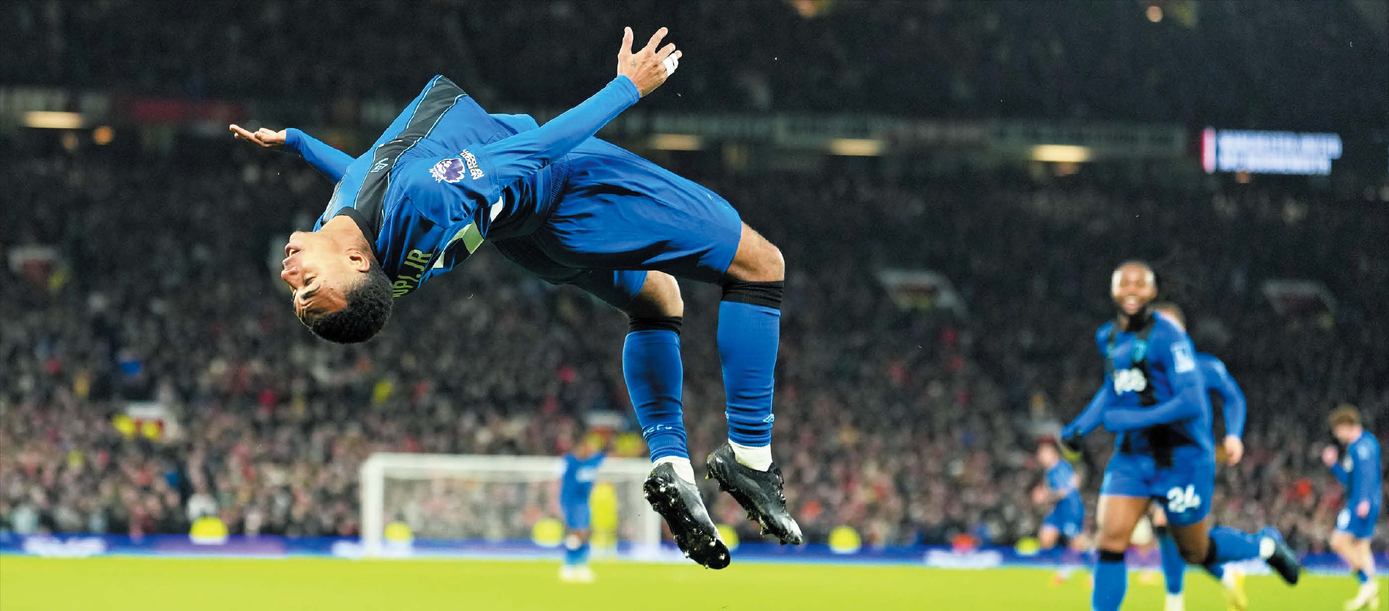 본머스 공격수 엘리 주니오르 크라우피가 16일(한국 시각) 맨체스터 유나이티드와 벌인 잉글랜드 프리미어리그 원정 경기에서 동점 골을 터뜨린 뒤 공중 제비를 돌며 자축하고 있다. 본머스는 후반 39분 크라우피의 득점에 힘입어 맨유와 4대4로 비겼다.