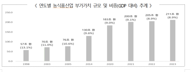 최근 농식품산업 부가가치 규모와 비중은 꾸준히 증가하고 있다. 연도별 농식품산업 부가가치 규모와 비중은 △2020년 183조원(9.0%) △2021년 200조원(9.1%) △2022년 205조원(8.9%) △2023년 211조원(8.9%)이다. 규모는 꾸준히 늘고 있지만 전체 산업에서 차지하는 비중은 매년 9% 안팎 수준이다.