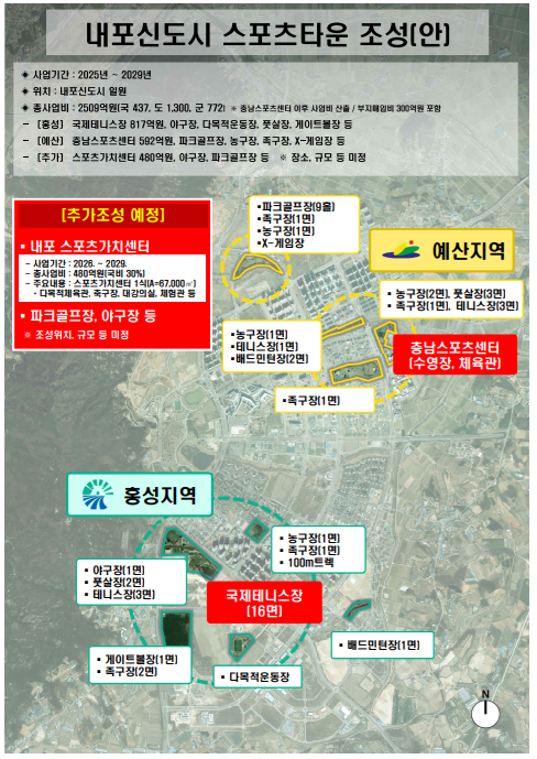 내포 스포츠타운은 총면적 27만6714㎡ 규모로, 사업비 2509억원이 투입된다. 충남국제테니스장을 중심으로 한 홍성 지역과 충남스포츠센터를 중심으로 한 예산 지역으로 나눠 단계적으로 조성된다.