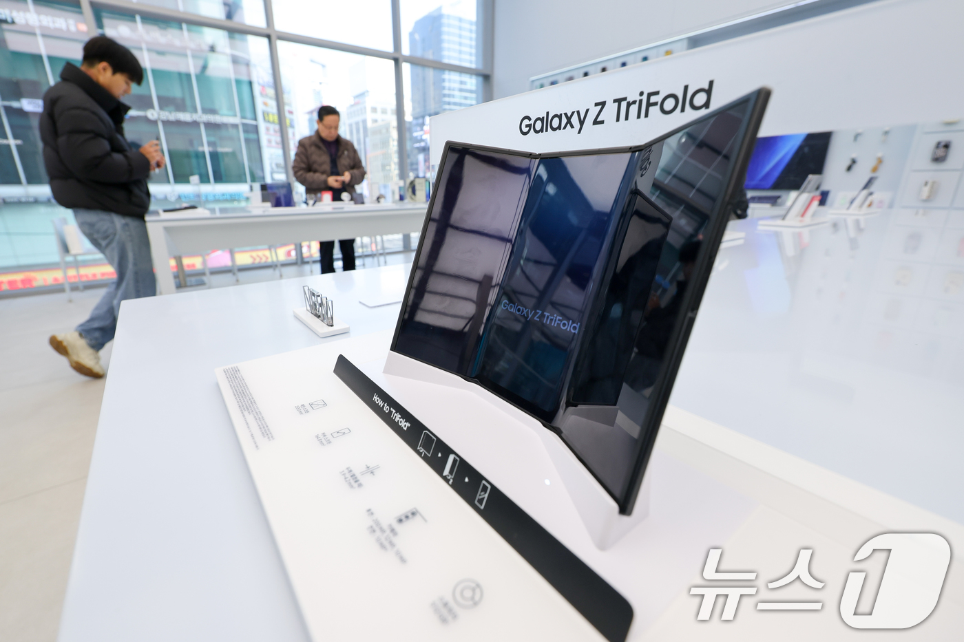 (서울=뉴스1) 안은나 기자 = 삼성전자의 두 번 접는 스마트폰 '갤럭시 Z 트라이폴드' 2차 판매가 시작된 17일 서울 서초구 삼성 강남에 갤럭시 Z 트라이폴드가 진열돼 있다. 출시와 동시에 인기를 끌고 있는 갤럭시 Z 트라이폴드는 2차 판매에서도 불과 2분 만에 완판되며 흥행 열기를 이어갔다. 2025.12.17/뉴스1