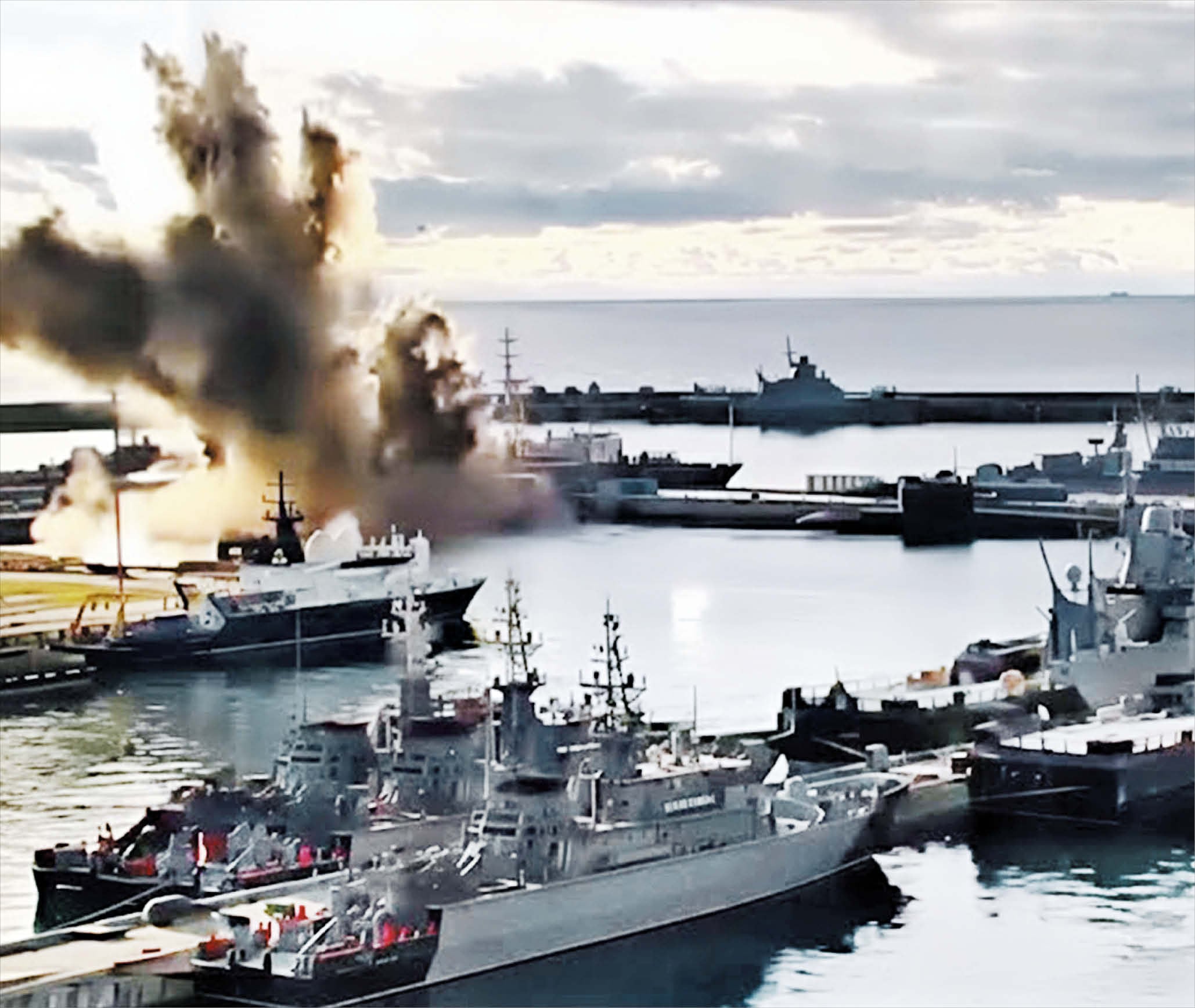 우크라이나가 수중 드론으로 흑해에 정박 중이던 러시아 잠수함을 폭파했다고 주장하며 공개한 영상. 바다 속에서부터 불꽃과 연기가 솟아오르고 있다. 대당 3억원대의 드론으로 6000억원에 달하는 미사일 잠수함을 무력화시킨 것으로, 사실이라면 드론으로 잠수함을 폭파한 세계 첫 사례다. 다만 러시아측은 “전혀 피해를 입지 않았다”고 반박했다.