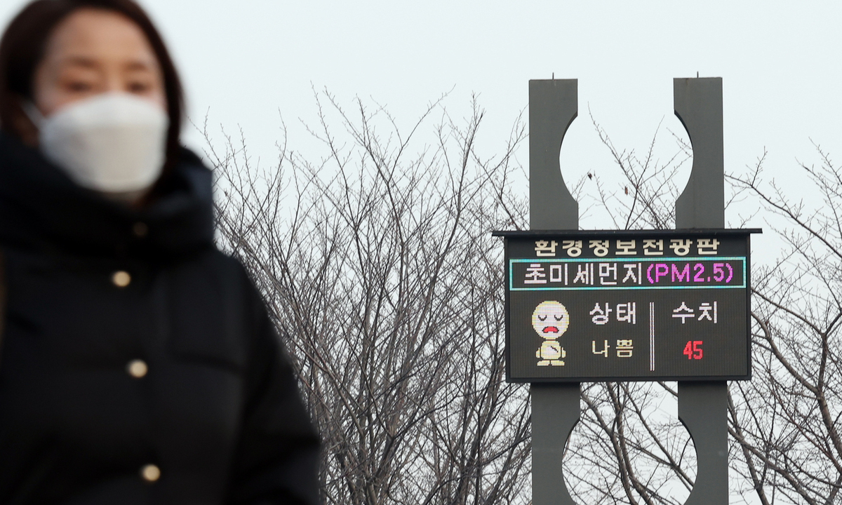수도권이 초미세먼지 나쁨을 보인 17일 오전 인천 남동구 중앙공원에 설치된 환경정보전광판에 초미세먼지 수준이 나쁨을 나타내고 있다. 뉴시스 |