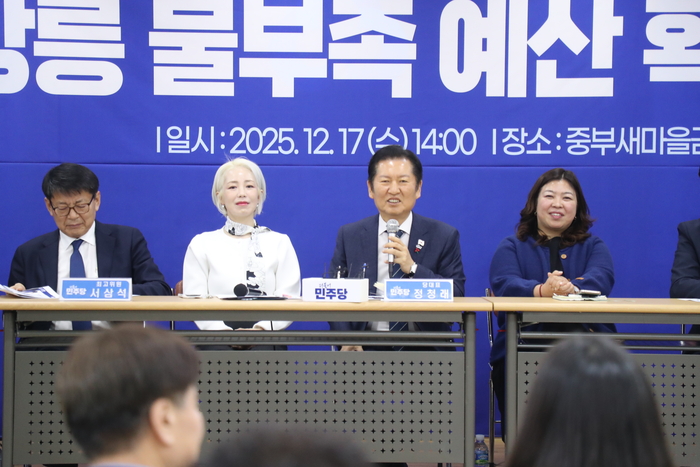 17일 강원 강릉시 금학동 중부새마을금고 본점에서 열린 강릉 물 부족 예산 확보 보고회에 참석한 더불어민주당 정청래 대표가 발언하며 활짝 웃고 있다. [사진출처=연합뉴스] |