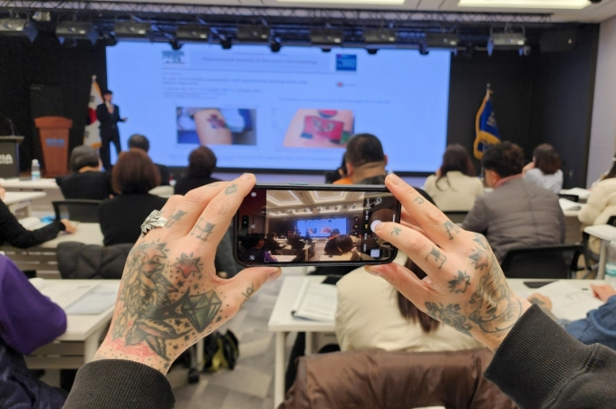 이날 김재홍 피부과 전문의가 타투 시술 후 감염된 사례를 보여주자, 한 남성 타투이스트가 스마트폰으로 강의 화면을 찍고 있다. /사진=정심교 기자 |