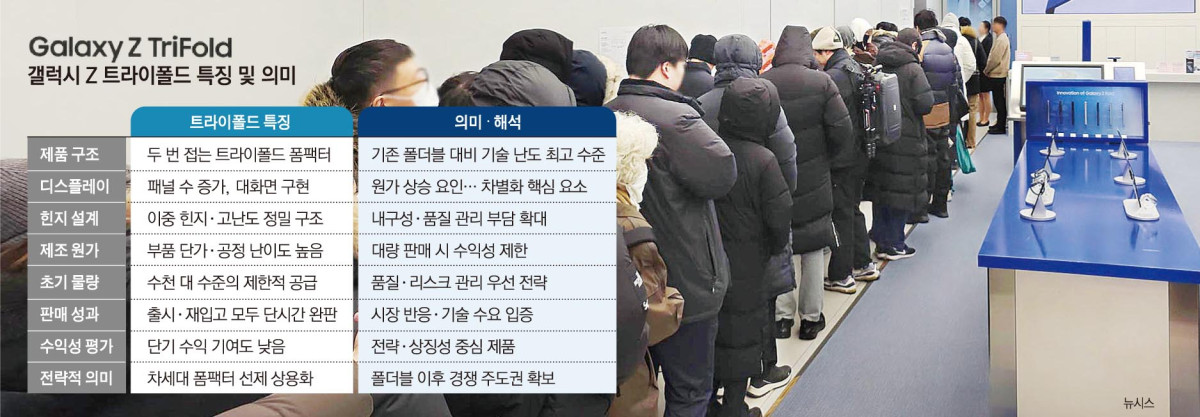 삼성전자의 ‘갤럭시 Z 트라이폴드’ 연이은 완판은 단순한 판매 성과를 넘어 차세대 스마트폰 경쟁 구도가 어디로 향하고 있는지를 보여주는 상징적 장면으로 해석된다. 트라이폴드는 구조적으로 제조 원가 부담이 큰 제품이다. 대량 판매를 통한 수익 극대화를 목표로 한 모델과는 거리가 있다. 팔면 팔 수록 손해 본다는 얘기가 나오는 것도 그런 이유에서다. 그럼에도 삼성전자가 해당 제품을 시장에 투입하고 반복 완판을 기록한 것은 ‘폼팩터 리더십’을 놓치지 않겠다는 전략적 판단의 결과라는 평가가 나온다.
