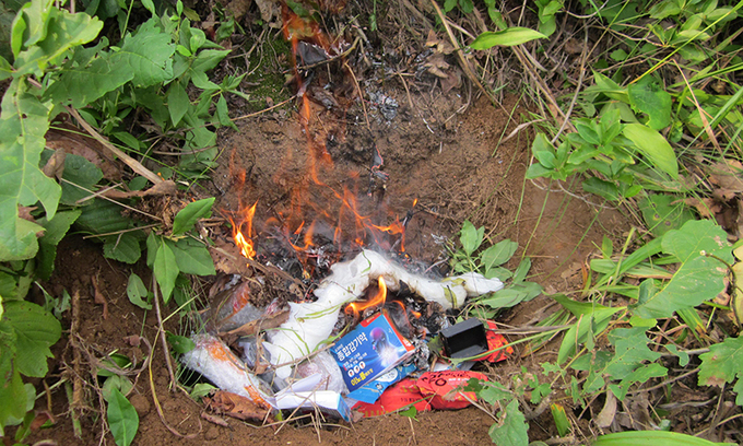 북한 조선중앙통신이 2024년 7월 14일 북한 국경지역에서 또다시 대북전단이 발견됐다며 대가를 각오해야 할 것이라는 김여정 노동당 부부장 담화와 함께 전단 추정 물체 소각 장면을 사진으로 보도했다. 평양=조선중앙통신·연합뉴스 |