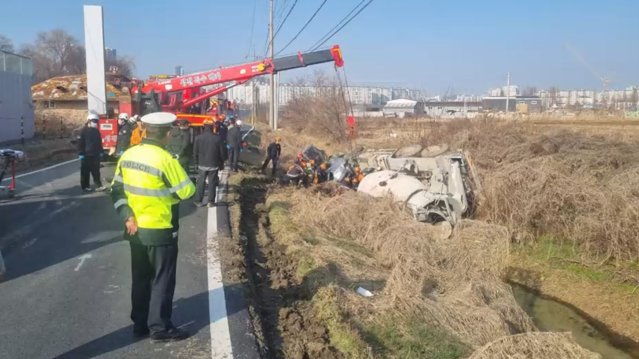 오늘(17일) 낮 12시쯤 충남 아산시 배방읍의 한 도로에서 레미콘 차량이 도로 옆 약 2m 아래 하천으로 추락했습니다.