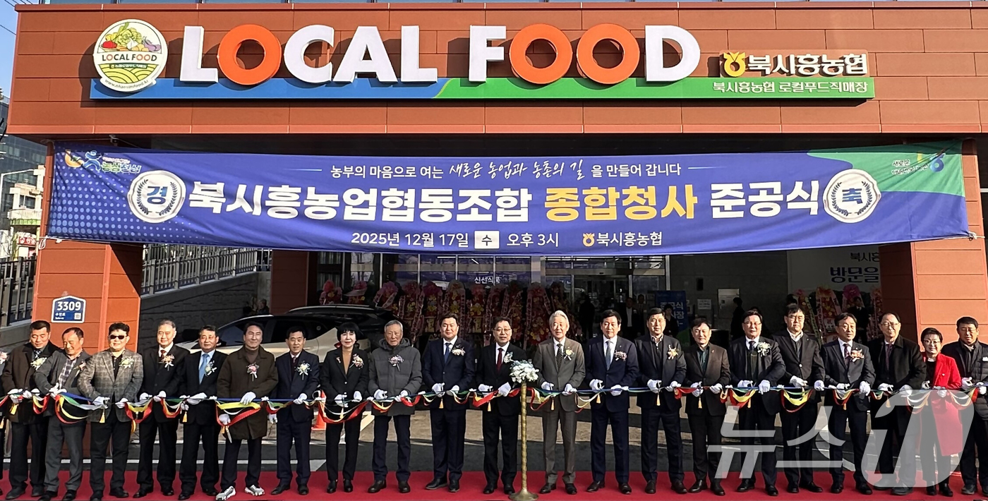 (서울=뉴스1) 김명섭 기자 = 17일 경기 시흥시 북시흥농협에서 열린 종합청사 준공식에서 강호동 농협중앙회장(사진 오른쪽에서 열 번째), 함병은 북시흥농협 조합장(열한 번째), 임병택 시흥시장(열두 번째) 등 참석자들이 커팅식을 하고 있다. (재판매 및 DB금지. 농협중앙회 제공) 2025.12.17/뉴스1