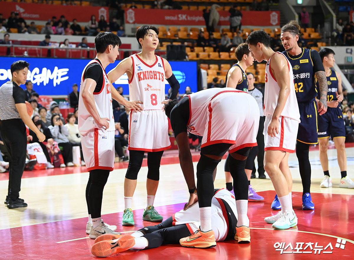 (엑스포츠뉴스 잠실학생체, 고아라 기자) 17일 오후 서울 잠실학생체육관에서 ‘2025-2026 동아시아 슈퍼리그(EASL)’ 서울 SK 나이츠와 일본 우츠노미야 브렉스의 경기, SK 워니가 몸으로 떨어져 코트에서 일어나지 못하고 있다.