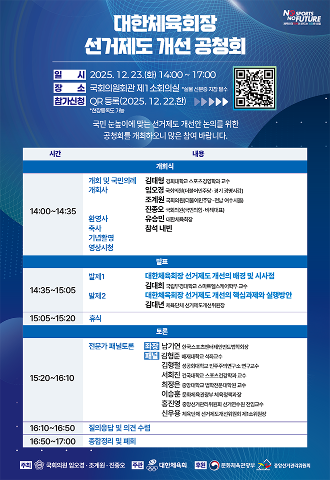 국회 문화체육관광위원회의 더불어민주당 임오경 의원(경기 광명시갑), 조계원 의원(전남 여수시을), 국민의힘 진종오 의원(비례대표)이 주최하고 대한체육회(회장 유승민)가 주관하며 문화체육관광부(장관 최휘영)와 중앙선거관리위원회(위원장 노태악)가 후원하는 ‘대한체육회장 선거제도 개선 공청회’가 12월23일(화) 오후 2시 국회의원회관 제1 소회의실에서 개최된다.