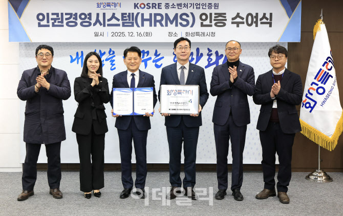 [이데일리 김태형 기자] 엄진엽(왼쪽 세번째부터) 중소벤처기업인증원장과 정명근 화성특례시장이 16일 인권경영시스템(HRMS) 인증서 및 인증현판 수여식 후 양 기관 관계자들이 기념촬영을 하고 있다.