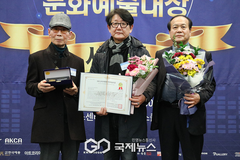 (서울=국제뉴스) 이대웅 기자 = '2025 제5회 아트코리아방송 문화예술대상' 시상식이 16일 오후 서울 중구 한국프레스센터 프레스클럽에서 열렸다. 이날 특별상 부문에서 올해의 작가 대상을 수상한 김중식이 기념 포즈를 취하고 있다.