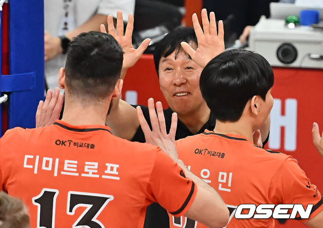 OK저축은행 신영철 감독이 5세트 접전 끝에 승리한 후 선수들과 승리의 하이파이브를 하고 있다. 2025.12.17 / foto0307@osen.co.kr