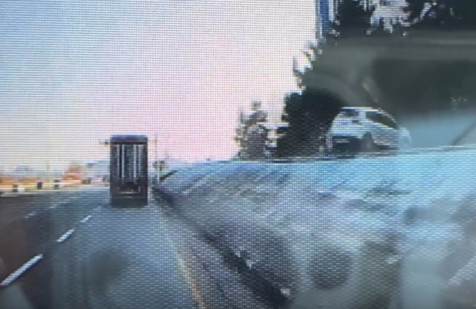 영상에 따르면 소형차와 나란히 달리던 대형 화물차가 방향 지시등을 켜더니 우측으로 차선 변경을 시도했다. 그러다 주행하고 있던 소형차를 들이받았다.