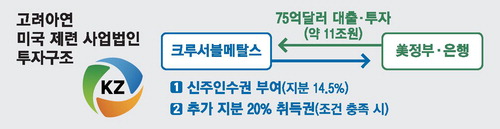 미국 국방부가 현지에서 제련사업을 직접 운영하는 고려아연 사업법인(크루서블메탈스유한회사)의 지분을 취득하는 것이다. 합작법인에는 미국 정부와 고려아연이 각각 19억4000만달러(약 2조8000억원), 5억8000만달러(약 8600억원)를 투입한다. 이후 해당 자금이 사업법인으로 들어가는 구조다. 이와 더불어 사업법인은 미국 정부·은행 등에서의 차입과 보조금 등을 합쳐 총 75억달러(약 11조원)의 투자금을 받는다.