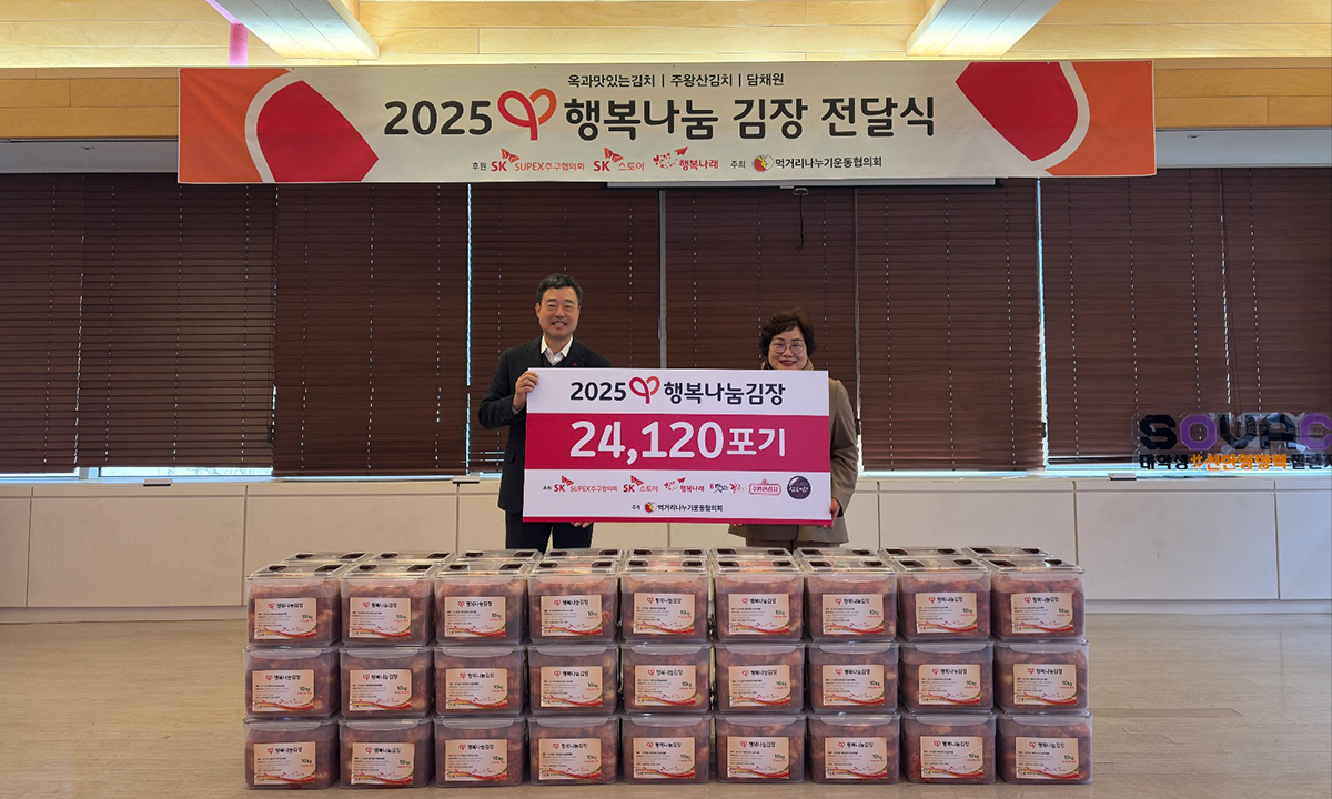 SK는 이날 사회적 기업 행복나래에서 ‘SK행복나눔김장’ 전달식을 열고 사회적 기업 3곳이 만든 김치를 먹거리나누기운동협의회(먹거협)에 전달했다. 먹거협은 이를 사회복지기관 539곳과 취약계층 2000여세대에 전달한다. 김치를 만든 사회적 기업 ‘주왕산김치’, ‘옥과맛있는김치’, ‘담채원’은 전달식에서 수익금 일부를 기부했다.