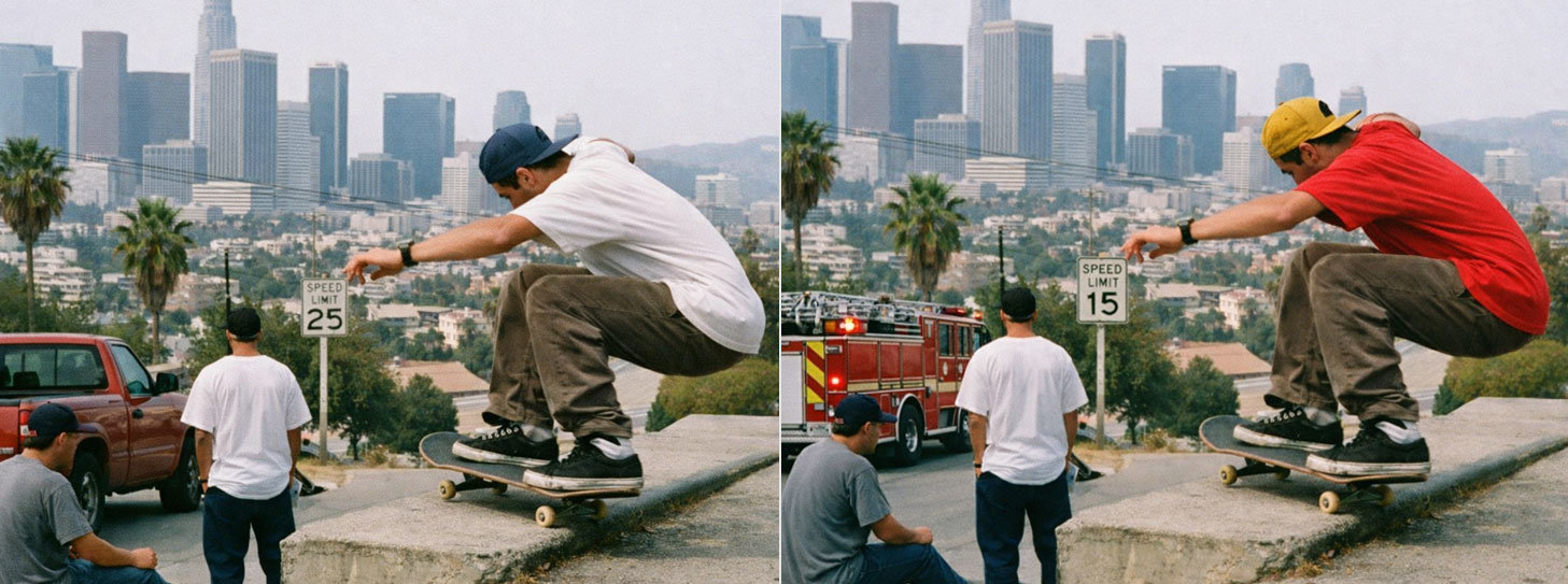 하얀 티셔츠가 빨간색으로… 오픈AI의 ‘GPT 이미지 1.5’를 활용하면 왼쪽 사진을 오른쪽 사진과 같이 정밀하게 편집하는 것이 가능하다. 스케이트보드를 탄 남성의 티셔츠는 빨간색으로, 모자는 노란색으로 바꾸고 배경에 있는 표지판의 제한속도 표시는 15로, 트럭을 소방차로 변경했다. 오픈AI 제공 |