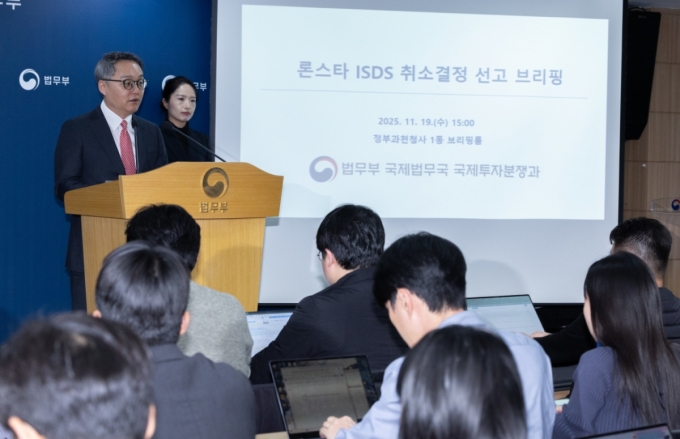 정홍식 법무부 국제법무국장이 지난달 19일 오후 경기도 과천시 중앙동 정부과천청사 내 법무부 청사에서 론스타 ISDS 취소 결정 선고 관련 브리핑을 하고 있다. /사진=뉴스1 |