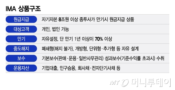 지난달 금융위원회는 한국투자증권과 미래에셋증권 2개사를 8조원 이상 종투사로 지정하고 IMA 업무를 허용했다. 이에 따라 한국투자증권은 이르면 이번주, 미래에셋증권은 다음주쯤 IMA 상품을 첫 출시할 전망이다. 2년만기 상품을 우선 출시할 것으로 보인다.
