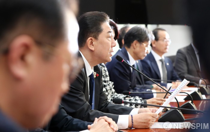 [서울=뉴스핌] 정일구 기자 = 김병기 더불어민주당 원내대표가 18일 오전 서울 여의도 국회에서 열린 정책조정회의에서 모두발언을 하고 있다. 2025.12.18 mironj19@newspim.com
