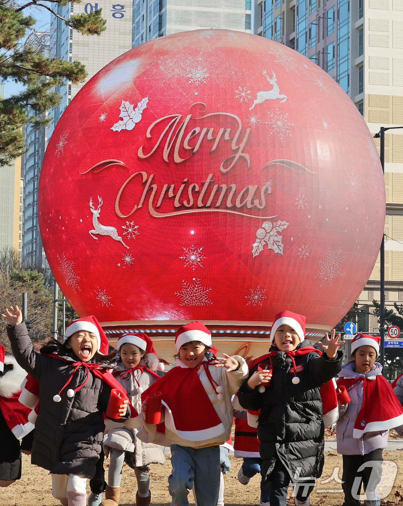 (서울=뉴스1) 장수영 기자 = 산타 복장을 차려입은 송파구청 어린이집 아이들이 18일 오전 서울 송파구 석촌호수 더 스피어에서 놀이를 하고 있다. 송파구는 연말연시를 맞아 더 스피어를 통해 크리스마스와 새해를 주제로 한 미디어아트를 상영한다. 2025.12.18/뉴스1