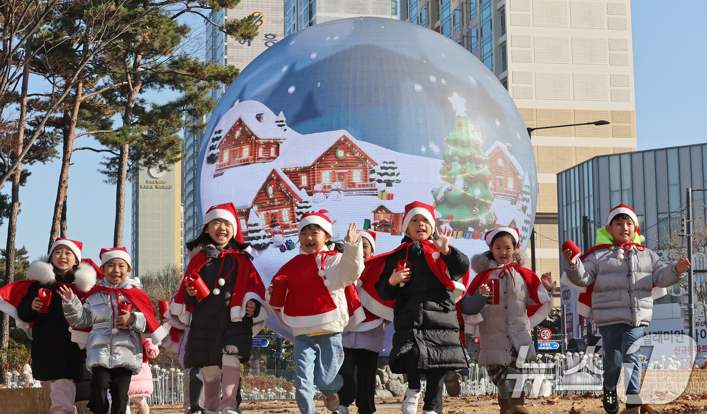 (서울=뉴스1) 장수영 기자 = 산타 복장을 차려입은 송파구청 어린이집 아이들이 18일 오전 서울 송파구 석촌호수 더 스피어에서 놀이를 하고 있다. 송파구는 연말연시를 맞아 더 스피어를 통해 크리스마스와 새해를 주제로 한 미디어아트를 상영한다. 2025.12.18/뉴스1