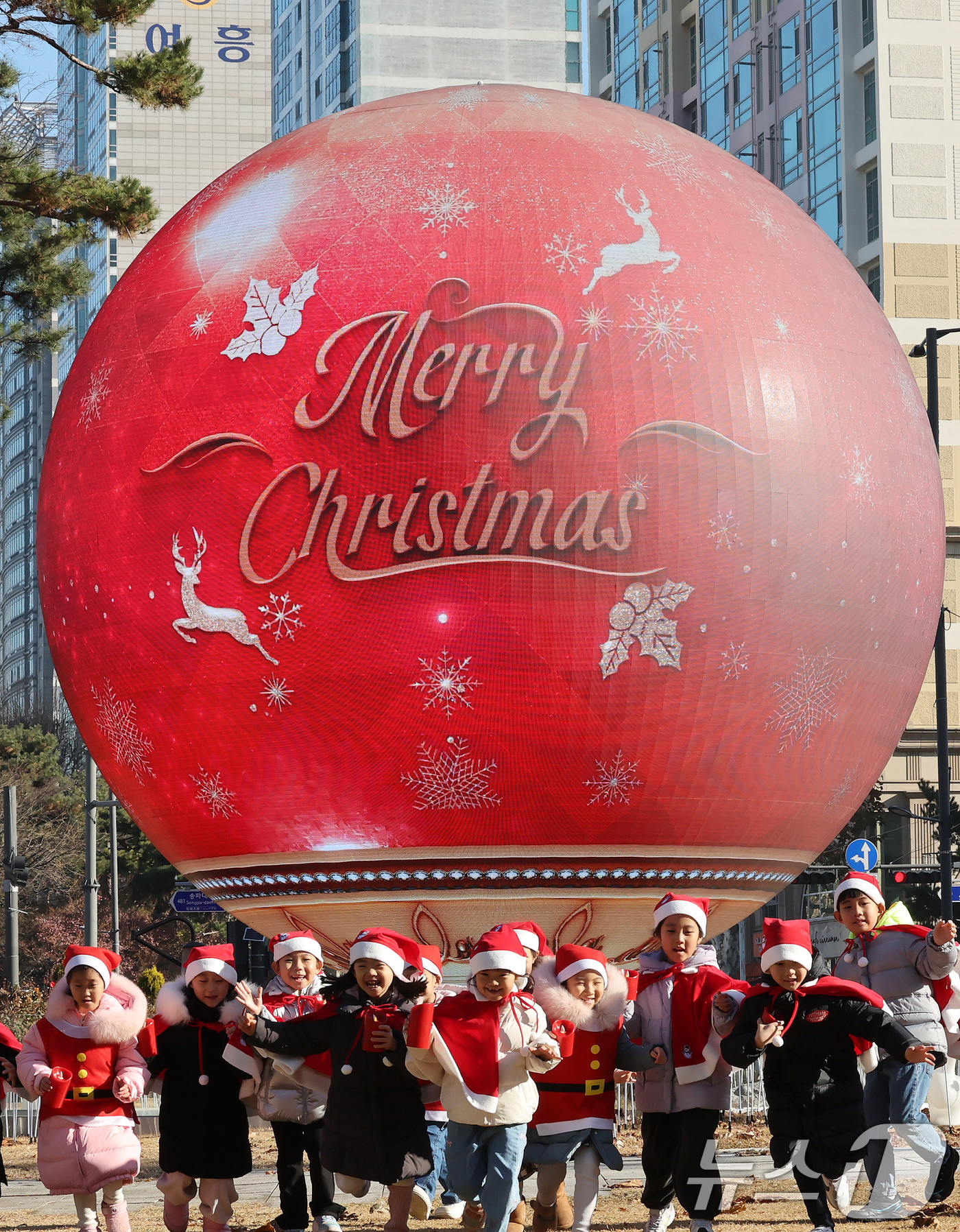 (서울=뉴스1) 장수영 기자 = 산타 복장을 차려입은 송파구청 어린이집 아이들이 18일 오전 서울 송파구 석촌호수 더 스피어에서 놀이를 하고 있다. 송파구는 연말연시를 맞아 더 스피어를 통해 크리스마스와 새해를 주제로 한 미디어아트를 상영한다. 2025.12.18/뉴스1