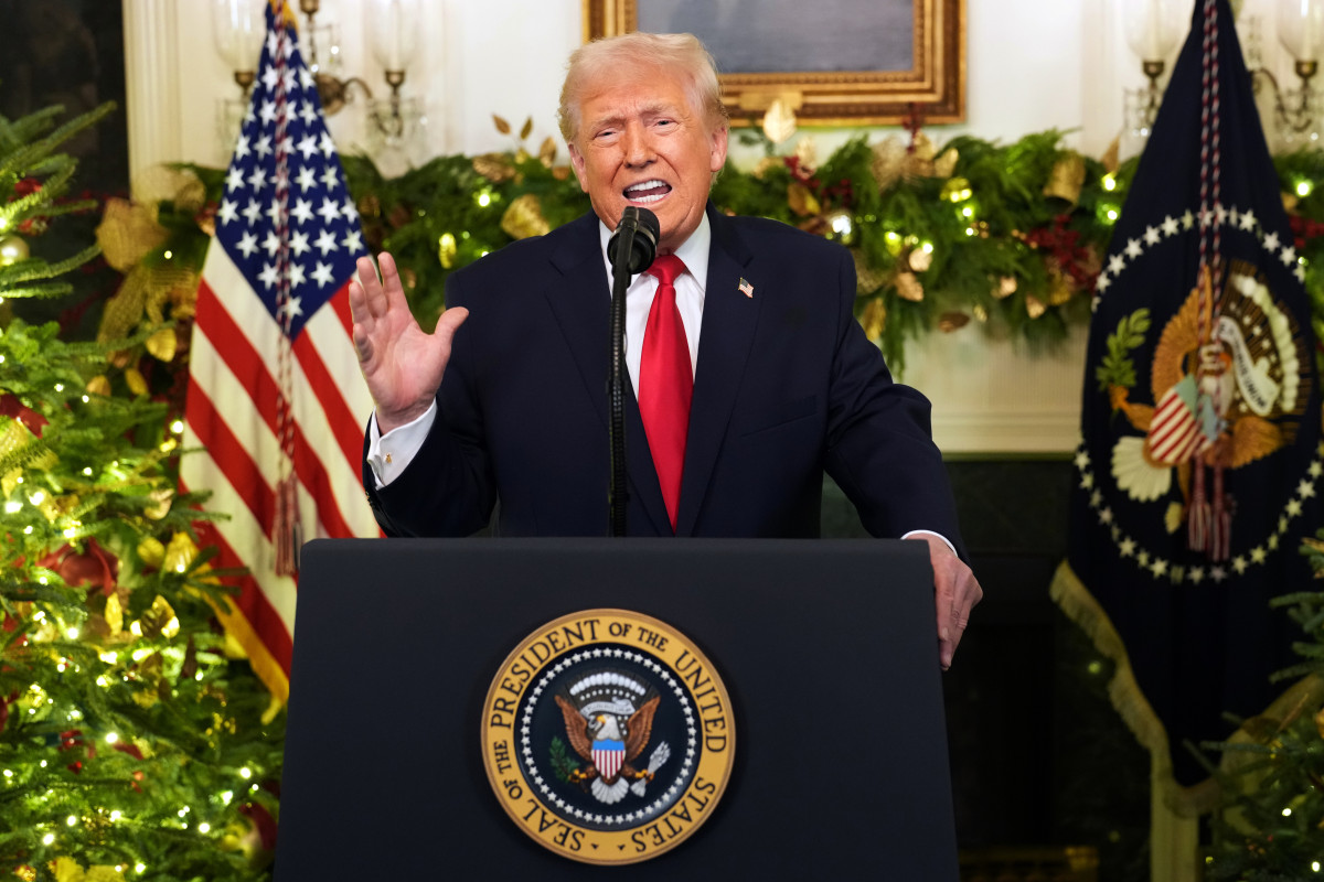 도널드 트럼프 대통령이 17일(현지시간) 백악관 외교 접견실에서 대국민 연설을 하고 있다. |