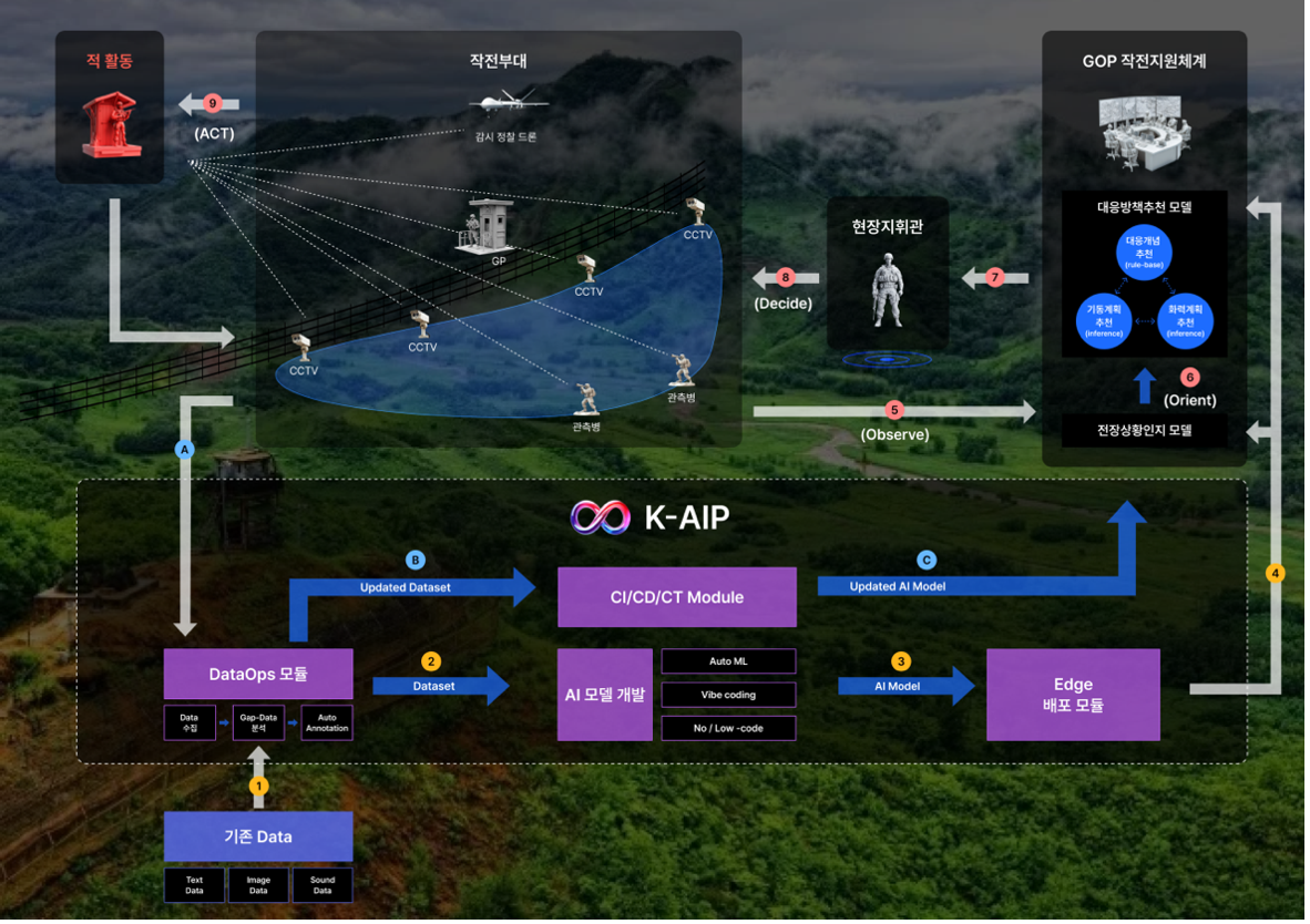 플랫폼 위에서는 전장 상황을 인지하는 AI 모델과 상황에 적합한 대응 방안을 제안하는 모델이 개발된다. 이들 모델은 지능형 GOP 작전지원체계 애플리케이션 형태로 현장에 배포돼 지휘관의 의사결정을 실시간으로 보조할 예정이다. 이를 통해 관측, 판단, 결심, 행동으로 이어지는 작전 수행 과정의 효율성이 향상될 것으로 기대된다.
