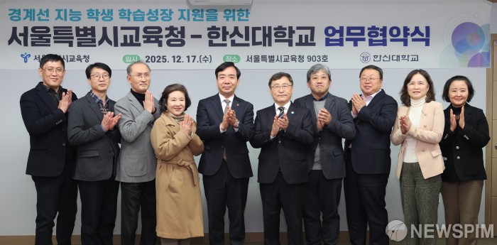 [서울=뉴스핌] 정근식 서울시교육감과 강성영 한신대 총장이 17일 오후 서울 종로구 서울시교육청에서 경계선 지능 학생 학습성장 지원을 위한 업무협약을 체결한 후 참석자들과 기념촬영하고 있다. [사진=서울시교육청 ] 2025.12.18 photo@newspim.com