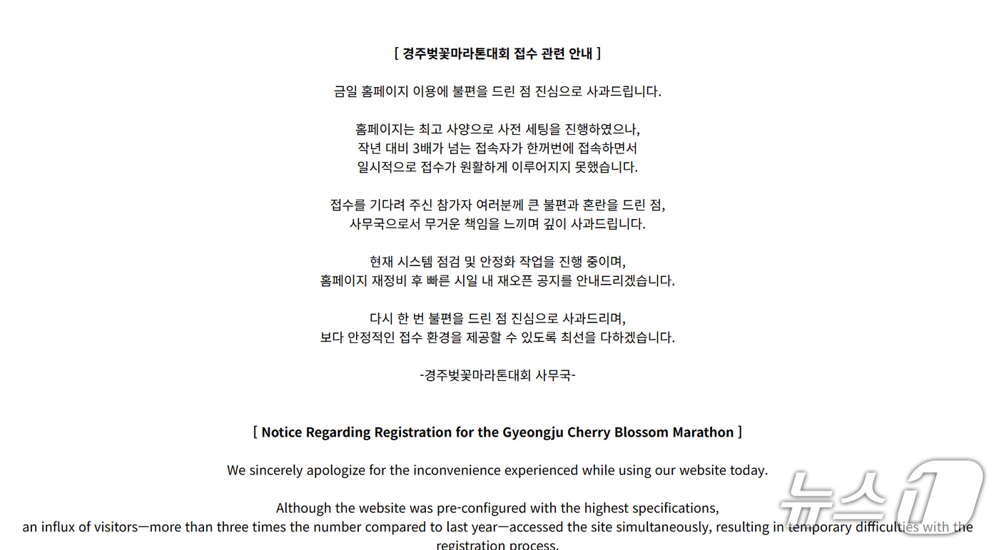 2026년도 경주벚꽃마라톤 대회 참가 신청을 받는 홈페이지가 3시간 넘게 다운되면서 참가 접수가 지연되고 있다. 사진은 경주벚꽃마라톤 사무국 홈페아지에 올라온 사과문.(경주벚꽃마라톤대회 사무국 홈페이지 갈무리, 재판매 및 DB금지) 2025.12.18/뉴스1 |