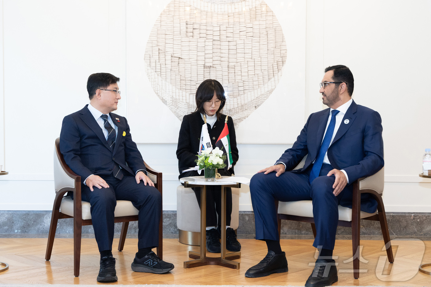 (서울=뉴스1) = 김성환 기후에너지환경부장관이 18일 서울 중구 롯데호텔에서 술탄 아흐마드 알 자베르 아랍에미리트(UAE) 산업첨단기술부 장관과 양자 회담을 갖고 있다. (기후에너지환경부 제공. 재판매 및 DB 금지) 2025.12.18/뉴스1